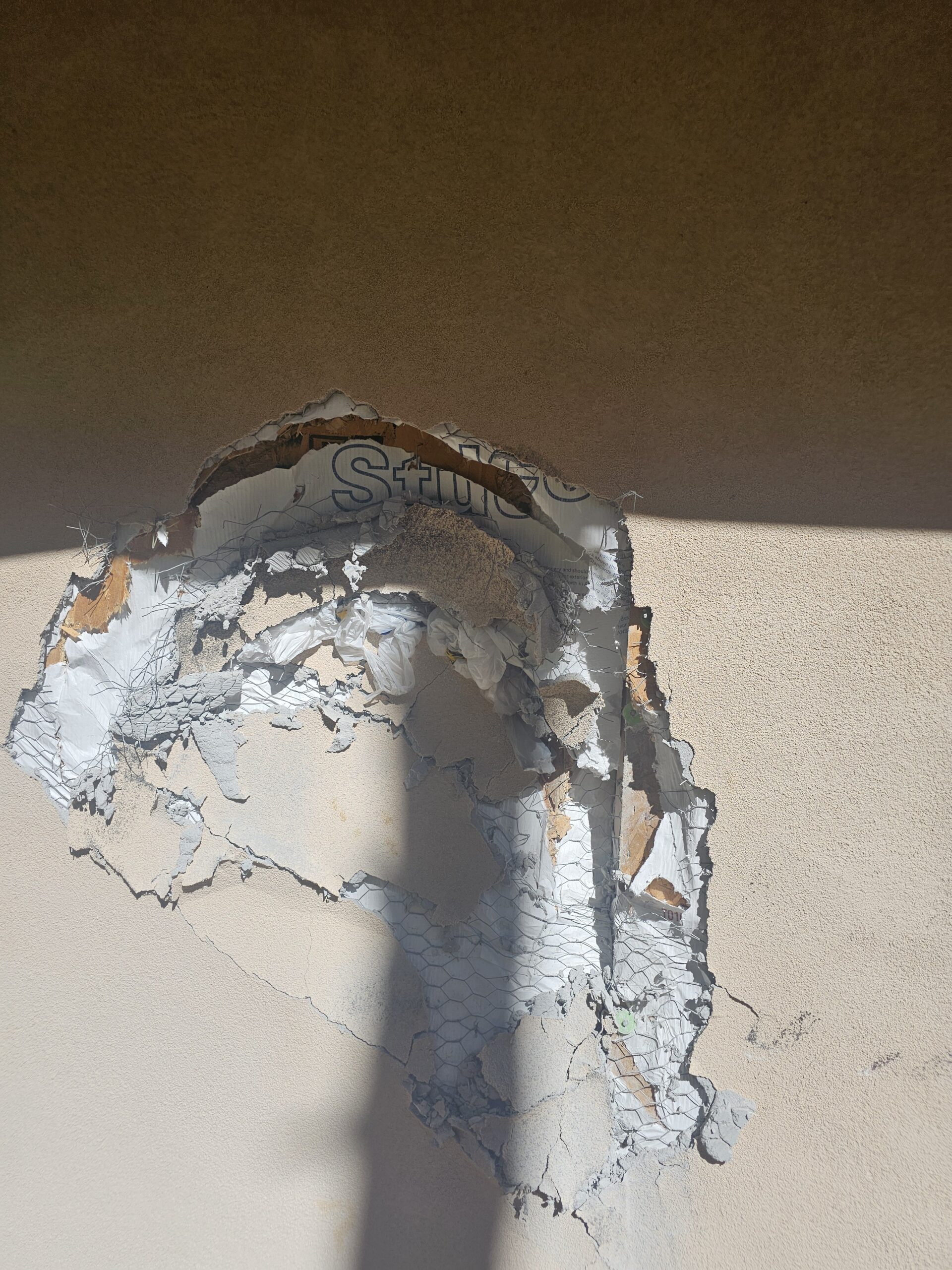 A home in Ruidoso was struck by a vehicle after it drove off a hill, causing major structural damage to the exterior wall and roofline. We removed damaged materials, rebuilt the framing, repaired the stucco exterior, and replaced the affected sections of roofing to restore the home safely and properly.